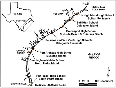 THSCMP is a research and outreach project that engages students living on the Texas coast in the study of the dynamic coastal environment. Bureau scientists work with middle and high school students and teachers, showing them how to measure topography, map vegetation lines and shorelines using GPS, and observe weather and wave conditions.